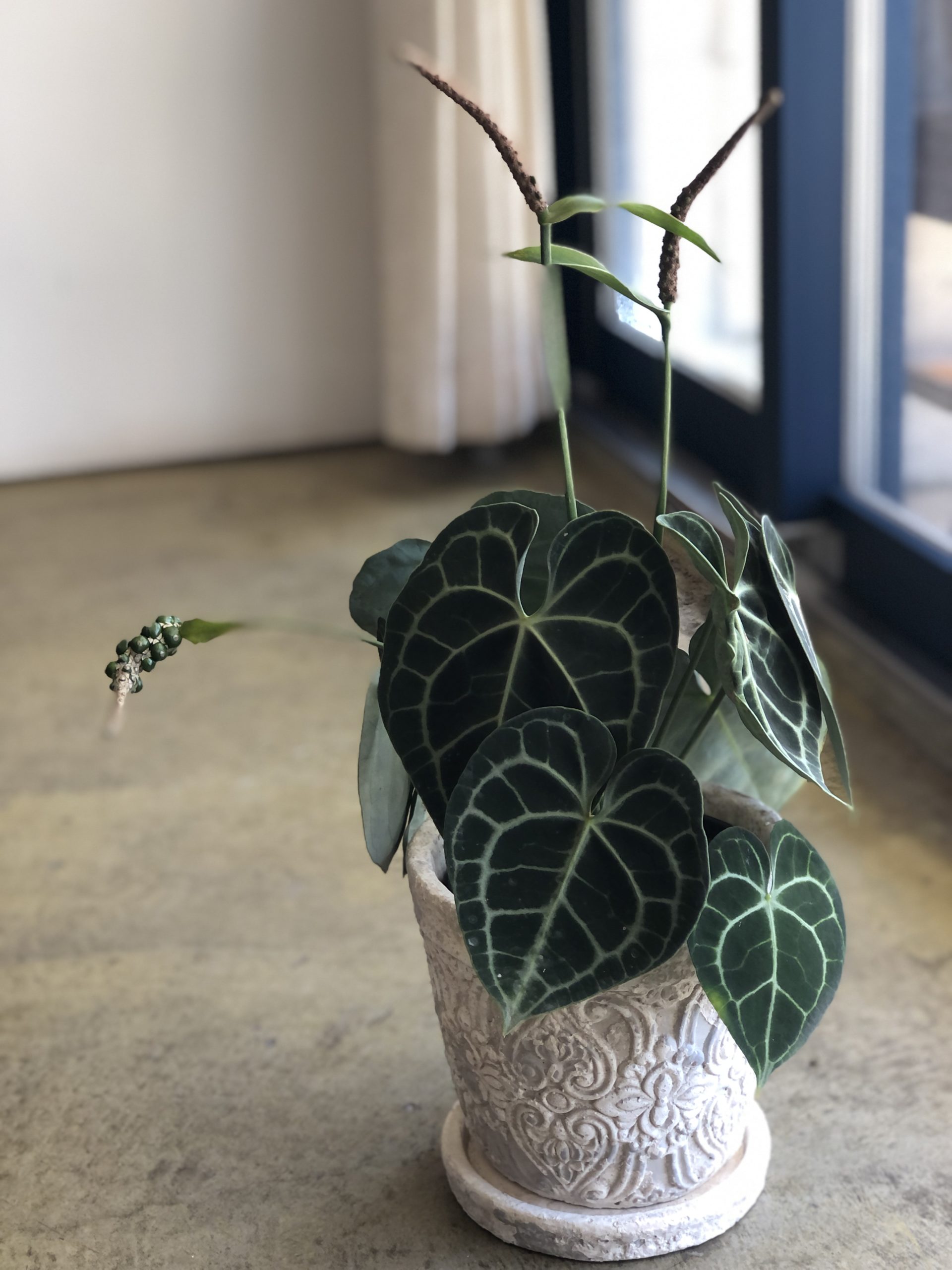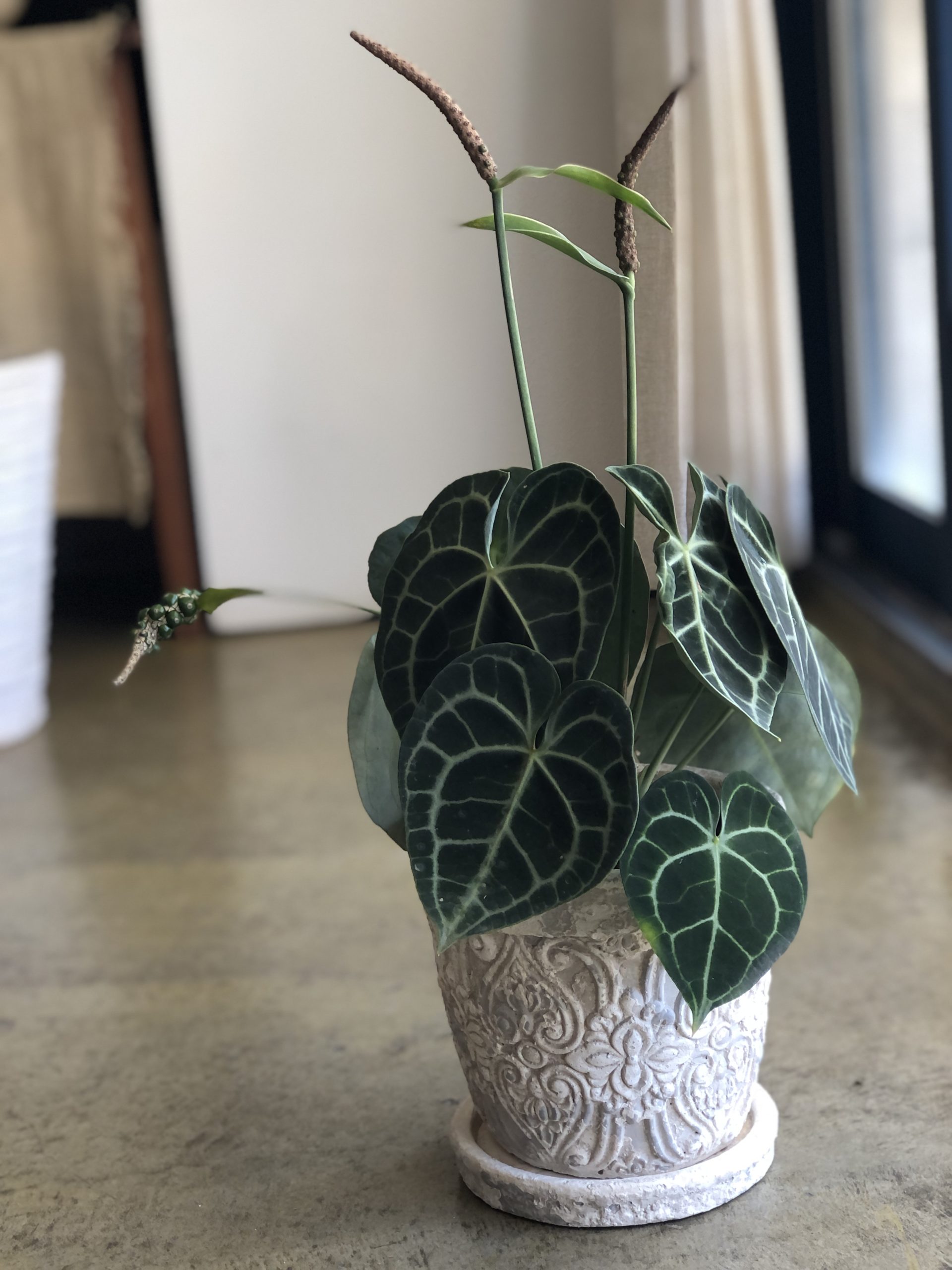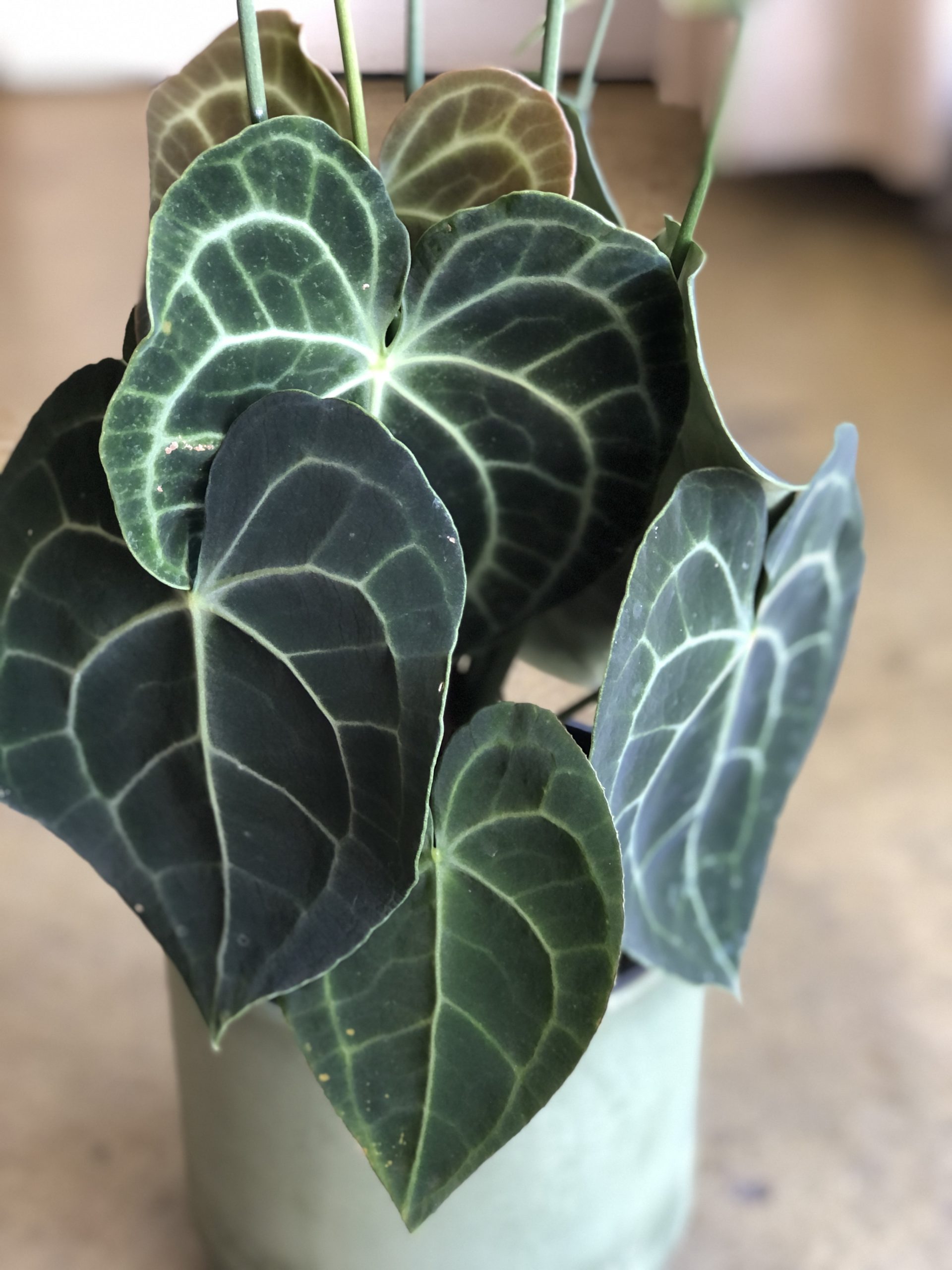 アンスリウム クラリネルビウムは、ベルベットのような質感をした濃い緑色の葉に、白く美しい葉脈が特徴的な観葉植物です。